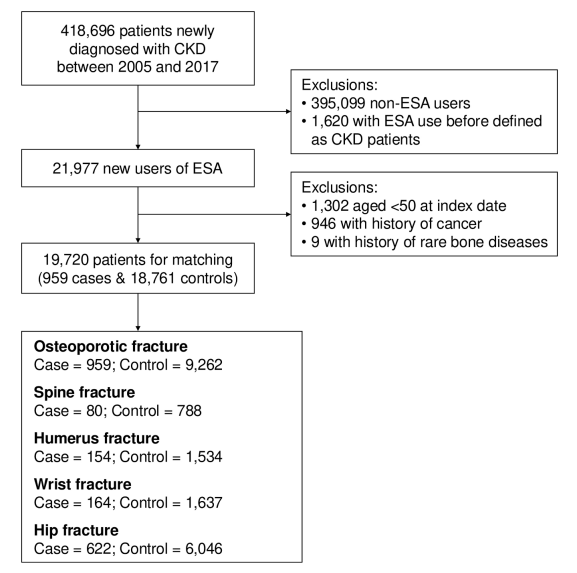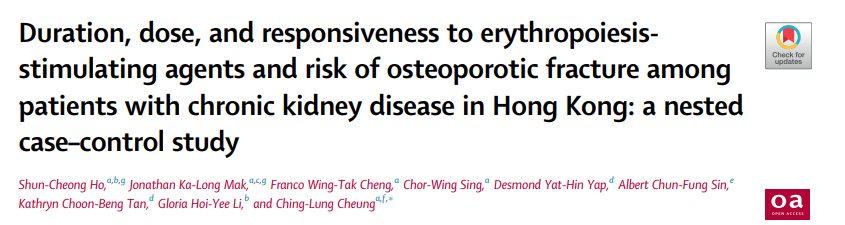 Ho, Shun-Cheong et al.Duration, dose, and responsiveness to erythropoiesis-stimulating agents and risk of osteoporotic fracture among patients with chronic kidney disease in Hong Kong: a nested case–control study.eClinicalMedicine, Volume 90, 103619