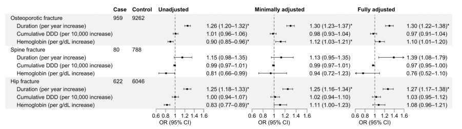 结果显示,匹配后纳入959例骨质疏松性骨折患者及9262名对照。骨折患者ESA治疗持续时间明显较长(平均2.1年vs. 1.4年),累计剂量也较高(平均14559.8 DDD vs. 9610.3 DDD)。多变量联合分析显示,ESA治疗持续时间每延长一年,整体骨折风险增加31%(aOR 1.31,95% CI 1.23-1.39),髋部骨折风险增加28%(aOR 1.28,95% CI 1.18-1.39),而累计剂量未表现出独立显著关联。ESA治疗响应者骨折风险显著高于非响应者(aOR 1.36,95% CI 1.14-1.63)。多项敏感性分析(调整贫血严重度、排除继发性甲状旁腺功能亢进患者、分透析状态亚组分析等)均支持核心结论。