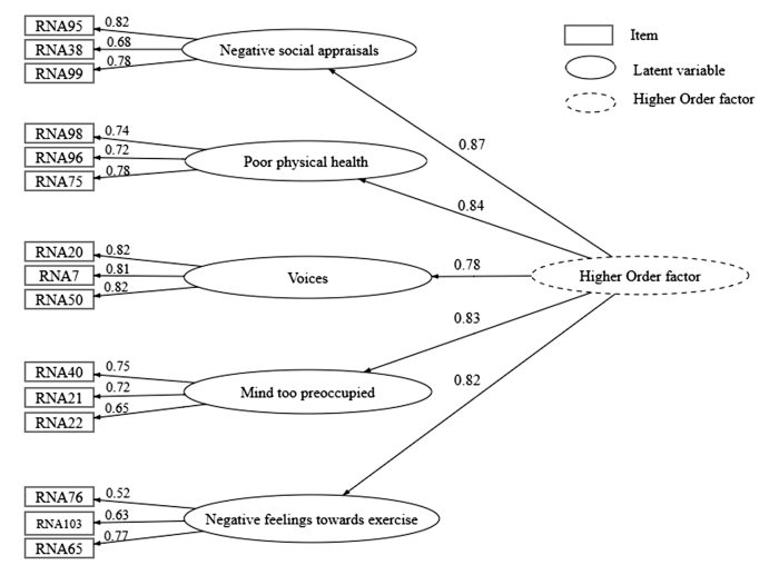 阻碍身体活动:包含5个因子(负面社会评价、身体健康差、幻听影响、思维 preoccupied、对运动的负面感受),共15项,模型拟合优(CFI=0.98, RMSEA=0.03),内部一致性ω=0.93,重测信度ICC=0.97。