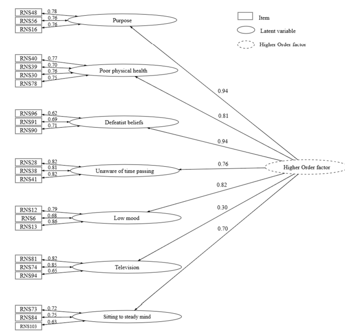 促进久坐行为:包含7个因子(无目的感、身体健康差、失败主义信念、时间感知缺失、情绪低落、电视依赖、静坐稳心),共22项,模型拟合良好(CFI=0.95, RMSEA=0.05),内部一致性ω=0.93,重测信度ICC=0.97。