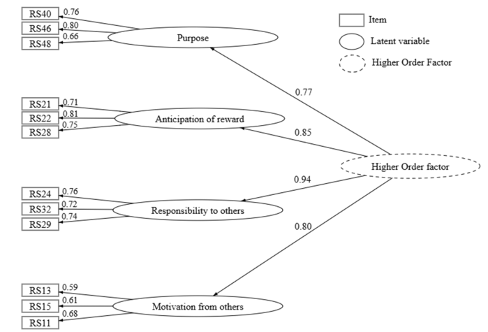 阻碍久坐行为:包含4个因子(目的感、奖励预期、对他人责任、他人激励),共12项,模型拟合良好(CFI=0.96, RMSEA=0.05),内部一致性ω=0.90,重测信度ICC=0.97。