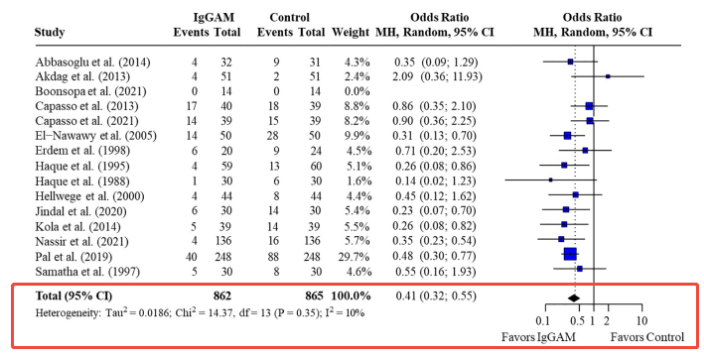 一项Meta分析纳入15项研究(13项新生儿研究和2项儿科研究),结果显示,与对照组相比,接受富含IgM的IVIG治疗的患者的死亡率显著降低59%(OR 0.41; 95% CI 0.32-0.55, P<0.001,图1)。进一步对新生儿研究进行的深入分析显示,较长治疗疗程(>3天)的疗效显著优于标准疗程 [(OR 0.32; 95% CI 0.22–0.47) vs. (OR 0.61; 95% CI 0.41–0.92), P=0.02] 10。研究表明,富含IgM的IVIG在新生儿和儿童脓毒症辅助治疗中可显著降低死亡风险,并且治疗持续时间可能影响临床结局。