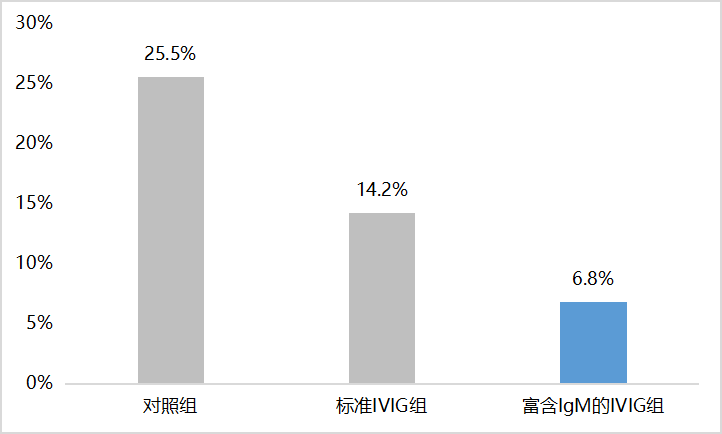 一项前瞻性双盲研究纳入130例确诊或疑似脓毒症新生儿,在支持疗法和抗生素治疗基础上,分别接受标准IVIG或富含IgM的IVIG(每日250 mg/kg)辅助治疗,疗程4天。另设65例仅接受相同支持疗法、抗生素及液体治疗但未使用IVIG的患儿作为匹配对照组。结果显示,在确诊脓毒症的病例中,感染相关死亡率分别为:富含IgM的IVIG组为6.8%,标准IVIG组14.2%,对照组25.5%(富含IgM的IVIG与对照组相比P=0.017,标准IVIG组与对照组相比P=0.19,两种免疫球蛋白治疗组间差异无统计学意义P=0.25,图4)13。研究表明,在标准治疗基础上联用富含IgM的IVIG,能显著提高新生儿脓毒症生存率,降低脓毒症的感染相关死亡率,凸显了其作为辅助治疗的重要价值。