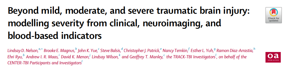 Nelson, L. D., Magnus, B. E., Yue, J. K., Balsis, S., Patrick, C. J., Temkin, N., Yuh, E. L., Diaz-Arrastia, R., Ryu, E., Maas, A. I. R., Menon, D. K., Wilson, L., Manley, G. T., the TRACK-TBI Investigators, & the CENTER-TBI Participants and Investigators. (2025). Beyond mild, moderate, and severe traumatic brain injury: modelling severity from clinical, neuroimaging, and blood-based indicators. eBioMedicine, *121*, 106001. https://doi.org/10.1016/j.ebiom.2025.106001