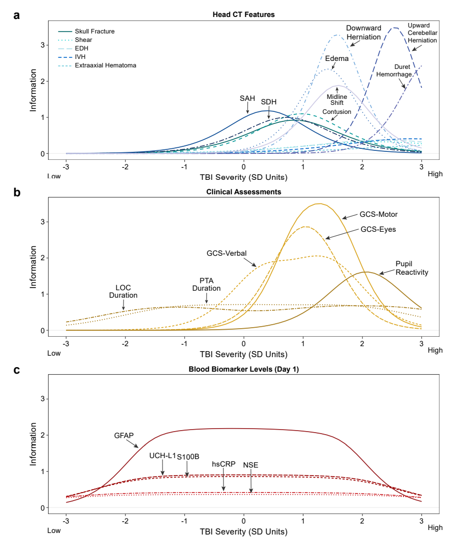 24 项创伤性脑损伤(TBI)严重程度指标的单项目反应理论(IRT)模型项目信息曲线,按可读性测量领域分层(a:脑成像;b:临床评估;c:血液生物标志物)