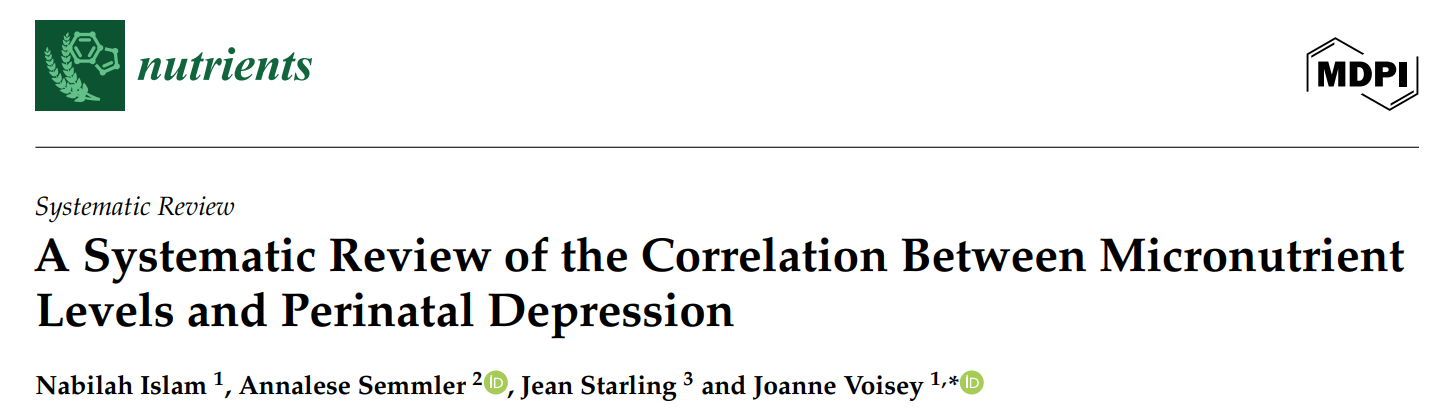 Islam, N.; Semmler, A.; Starling, J.; Voisey, J. A Systematic Review of the Correlation Between Micronutrient Levels and Perinatal Depression. Nutrients 2025, 17, 3479. https://doi.org/10.3390/nu17213479