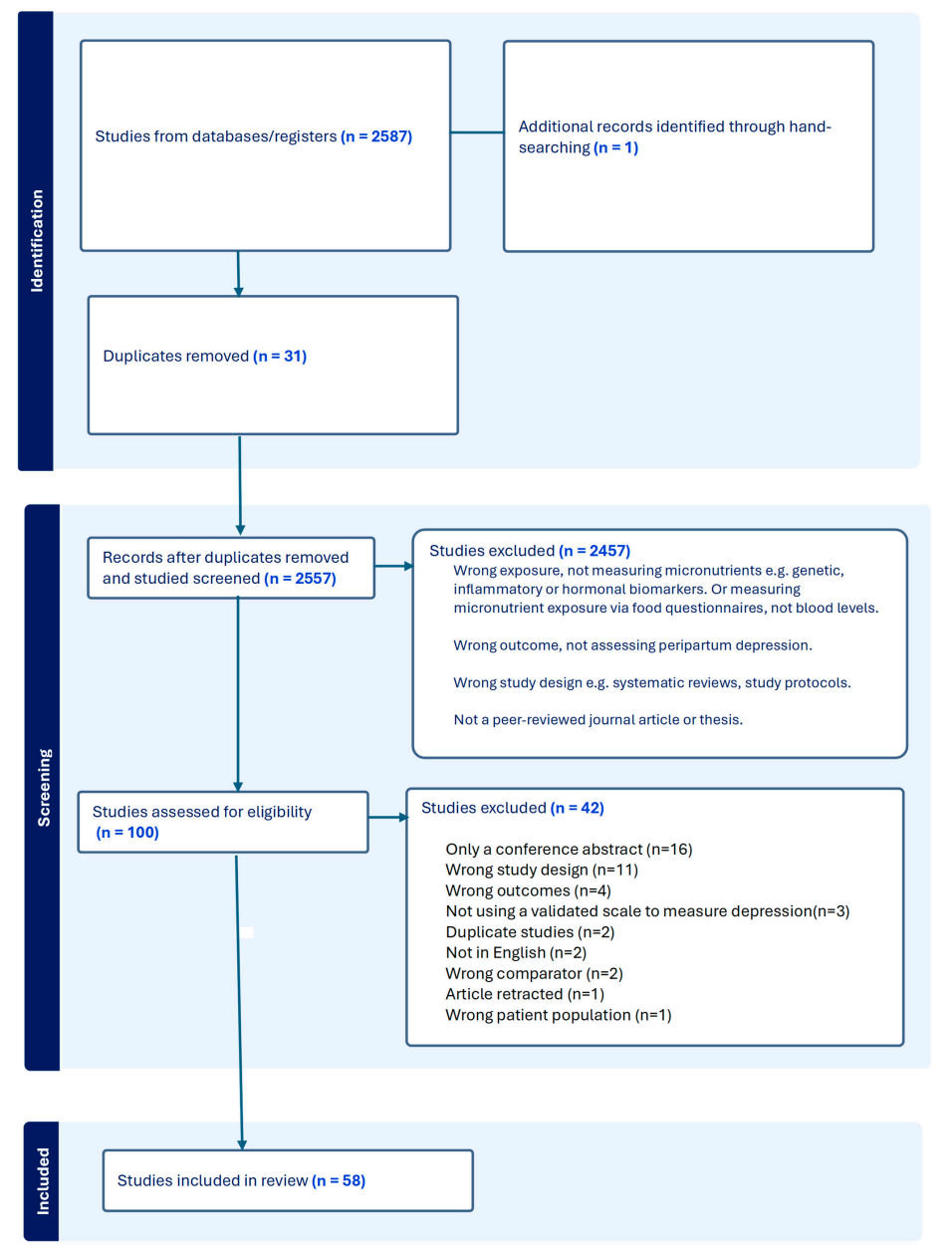 遵循PRISMA指南,本综述检索了MEDLINE、EMBASE、PsycINFO、CINAHL、Scopus及Web of Science数据库,时间范围至2024年6月。纳入对象为怀孕或产后12个月内的女性,检测血液微量营养素水平与抑郁症状,采用标准化抑郁量表或临床诊断。质量评估采用纽卡斯尔-渥太华量表(NOS)及Joanna Briggs研究所(JBI)工具。通过结构化叙述综合方法整合数据。