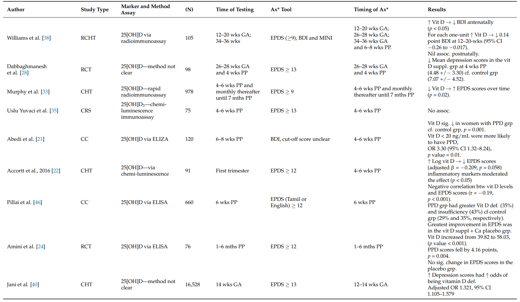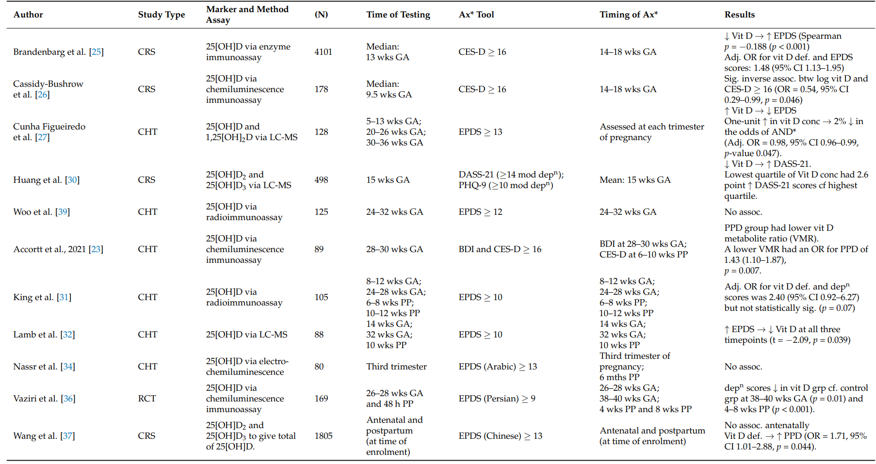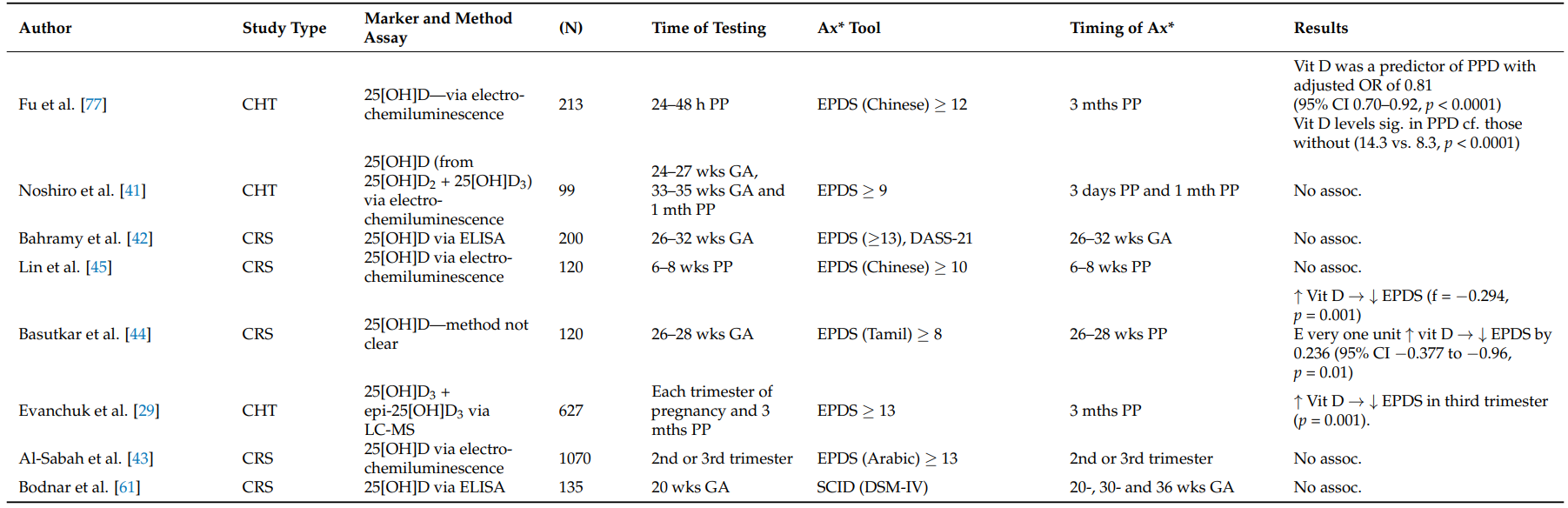 维生素B12与叶酸的关联结果不一致,可能因研究设计及协变量控制差异。锌与抑郁负相关,铜水平升高在两项研究中与抑郁相关联,提示炎症与氧化应激可能介导铜的影响。 多数研究采用爱丁堡产后抑郁量表(EPDS)评估抑郁状态,但应用的截断值差异较大(≥10至≥13),增加了结果异质性。影响因素还包括年龄、肥胖、教育、社会经济地位、种族、婚姻状况及既往精神病史等。
