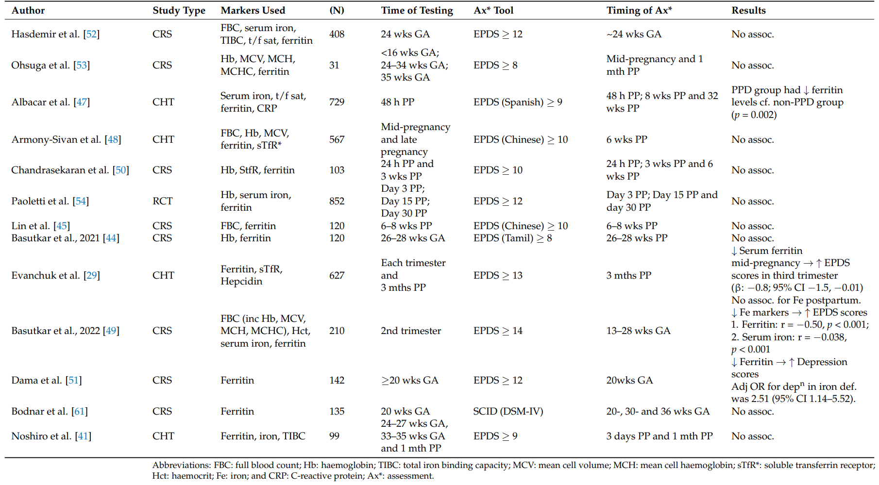 表:铁相关研究与围产期抑郁的研究结果摘要