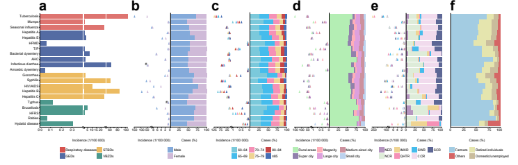 不同年龄组疾病负担存在差异,STBDs和VBZDs在60-64岁组发病率最高,呼吸道疾病在75-79岁组最高,GEDs在80-84岁组最高。男性发病率显著高于女性,农村高于城市。VBZDs在小城市发病率最高,其他三类疾病在超大城市最高。