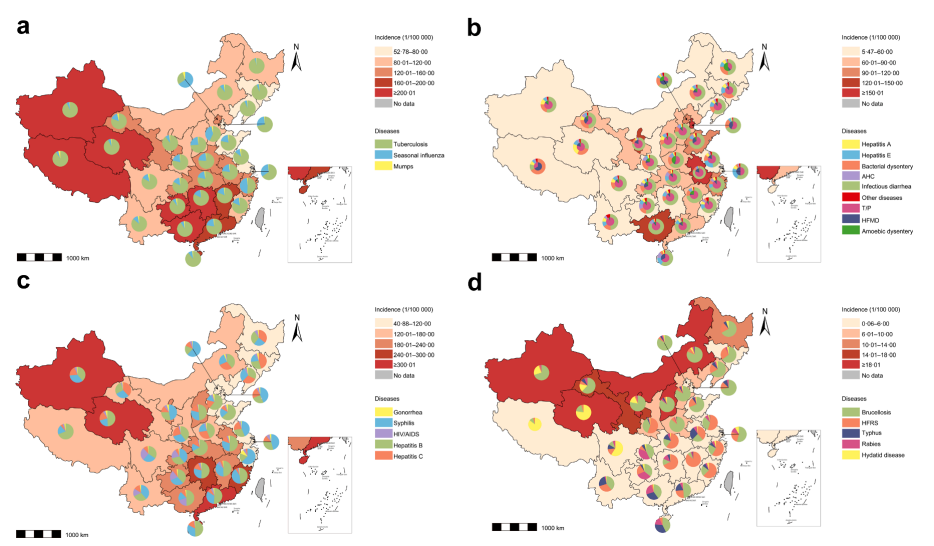 图:2014–2022年中国老年人群各类传染病发病率及构成比例的地理分布