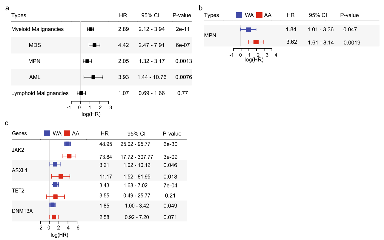 种族分层分析显示,CHIP与骨髓系恶性肿瘤风险在非裔美国人和白人美国人中均显著增加,但CHIP与MPN的关联在非裔美国人中更强(HR=3.62 vs 1.84)。此外,携带JAK2突变的非裔美国人发展骨髓系肿瘤风险远高于白人美国人(HR高达73.84与48.95)。