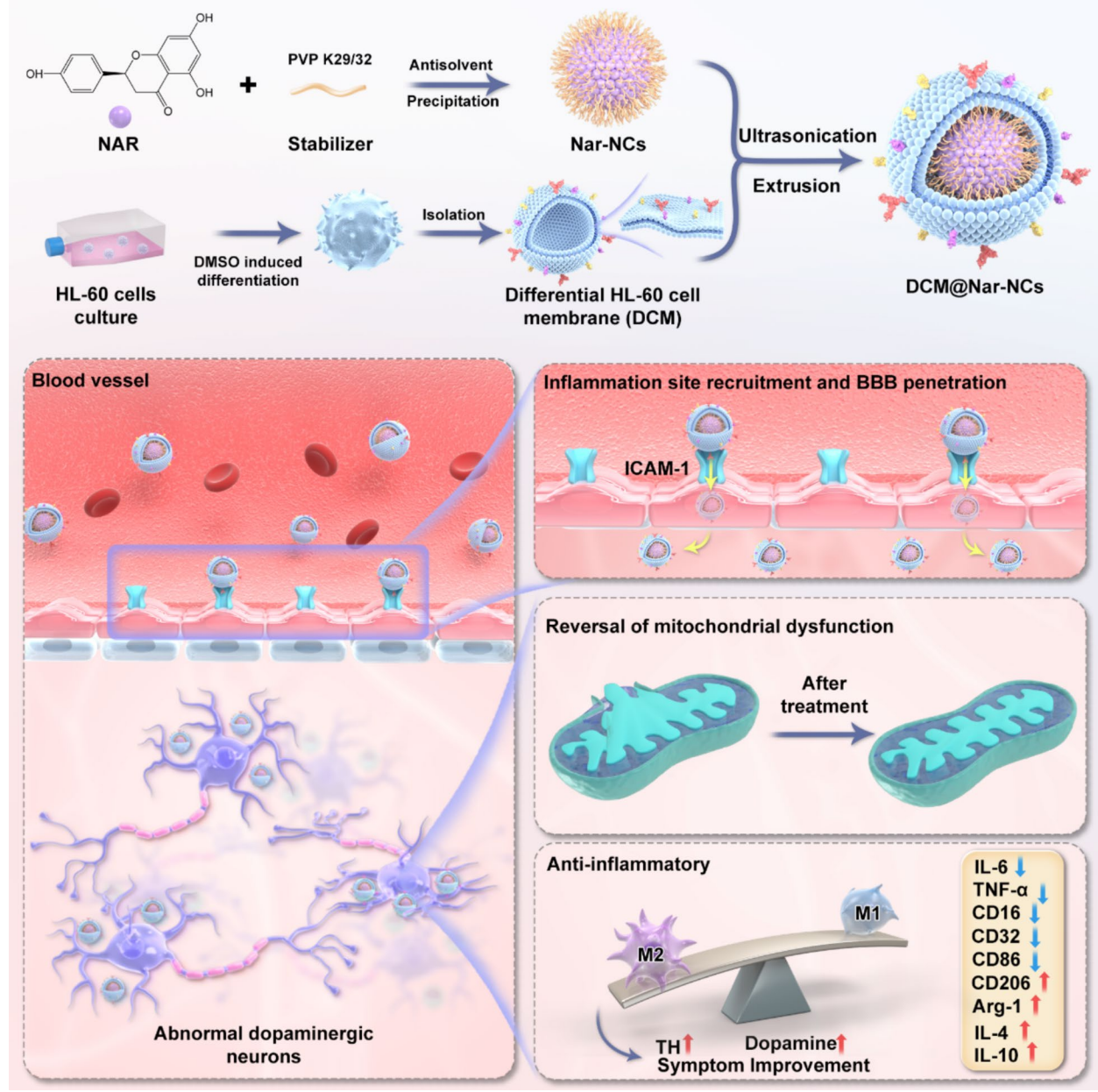 面对这一困境,纳米技术带来了新的曙光。近期,一项发表于Chinese Medicine的研究,成功开发出一种名为 DCM@Nar-NCs 的仿生纳米递送系统,它如同一枚“生物导弹”,不仅能精准穿越血脑屏障,还能直击神经炎症核心,在帕金森病模型中展现出卓越的治疗潜力。
