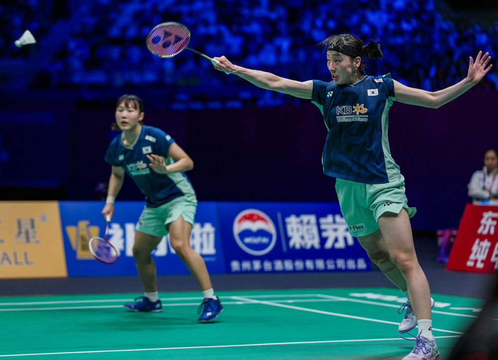 5月4日,韩国队组合白荷娜(左)/李绍希在比赛中。最终,她们在女双比赛中0比2不敌中国队组合刘圣书/谭宁。当日,在福建厦门举办的2025年苏迪曼杯世界羽毛球混淆集团锦标赛决赛中,中国队3比1克服韩国队,夺得冠军。新华社记者孙非 摄